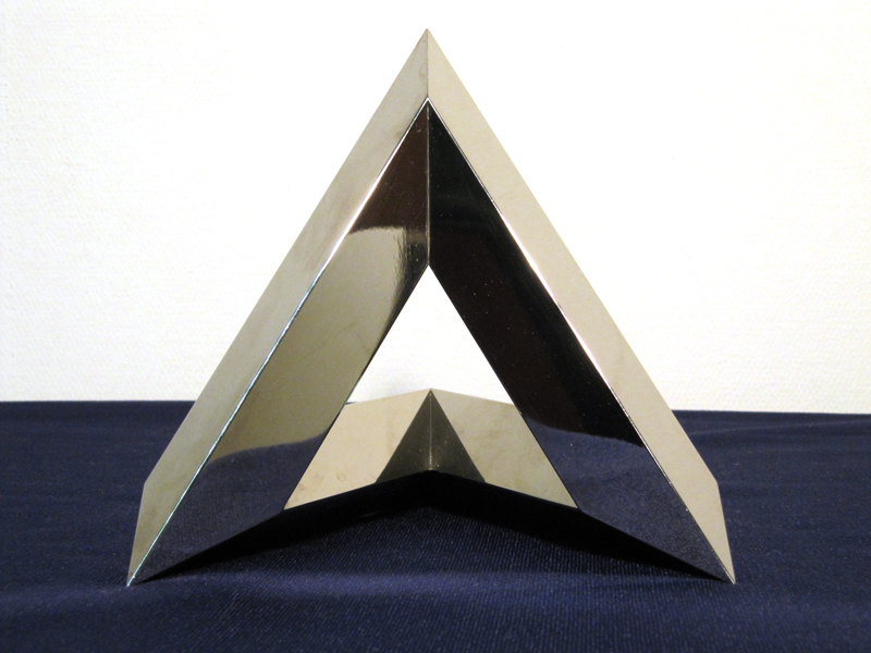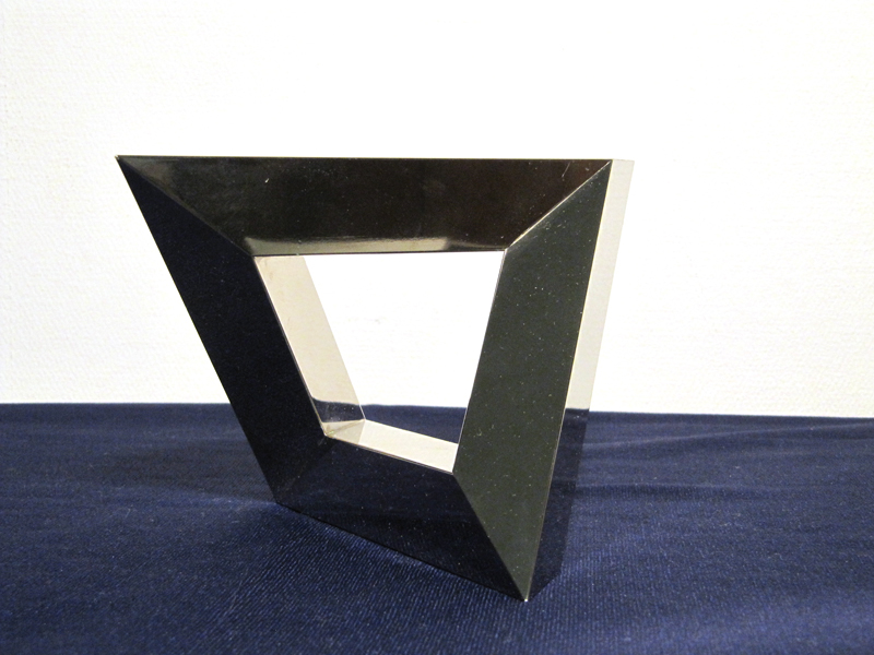 nickel cromato | 20x20x20Der Diacubo setzt das Thema der Diagonale im Würfel fort und wurde als Modell einer sehr viel grösseren Skulptur entworfen. „Sehr viel grösser“ meint: so gross wie eine autarke Stadt, die mit einer minmalen Auflagefläche einer Würfeldiagonale auskommt!